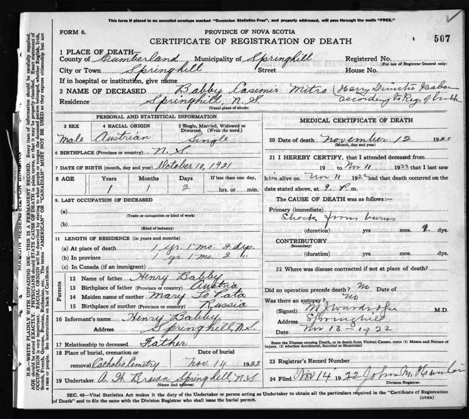 Death Registration: Year: 1922 file: 65 number: 507