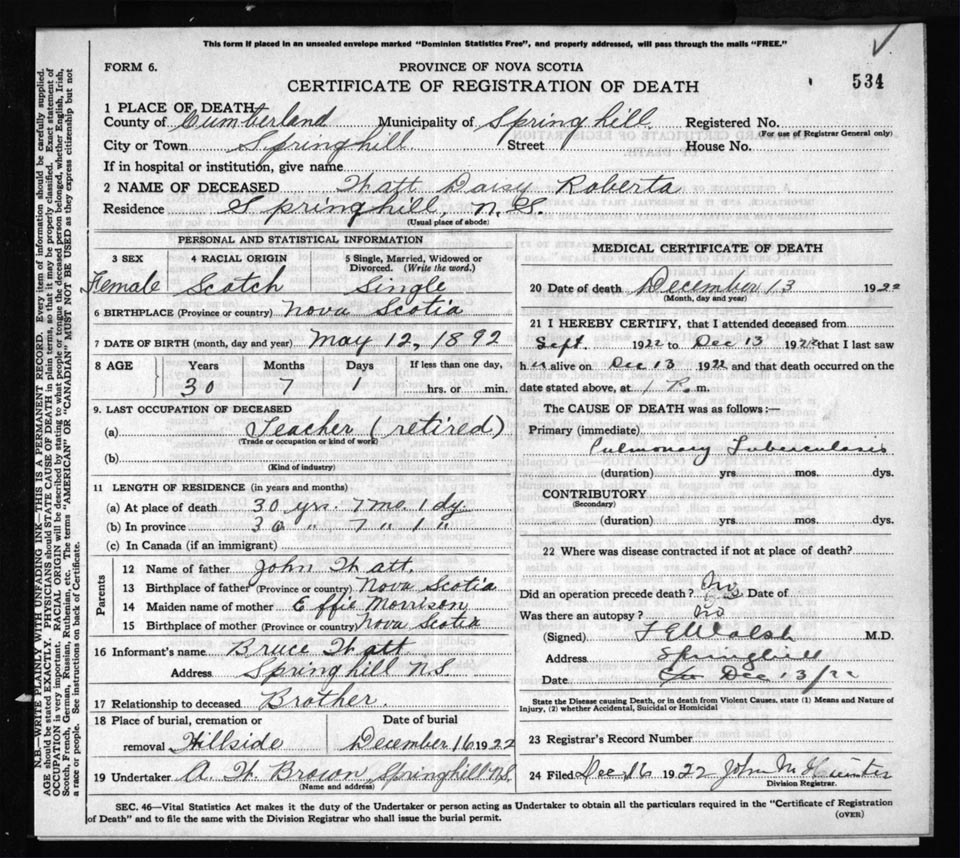 Death Registration: Year: 1922 file: 65 number: 534