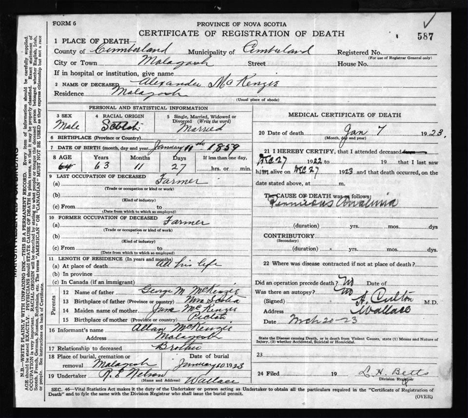 Death Registration: Year: 1923 file: 65 number: 587