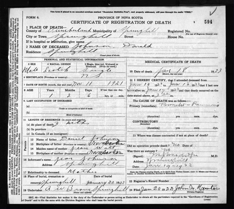 Death Registration: Year: 1923 file: 65 number: 594