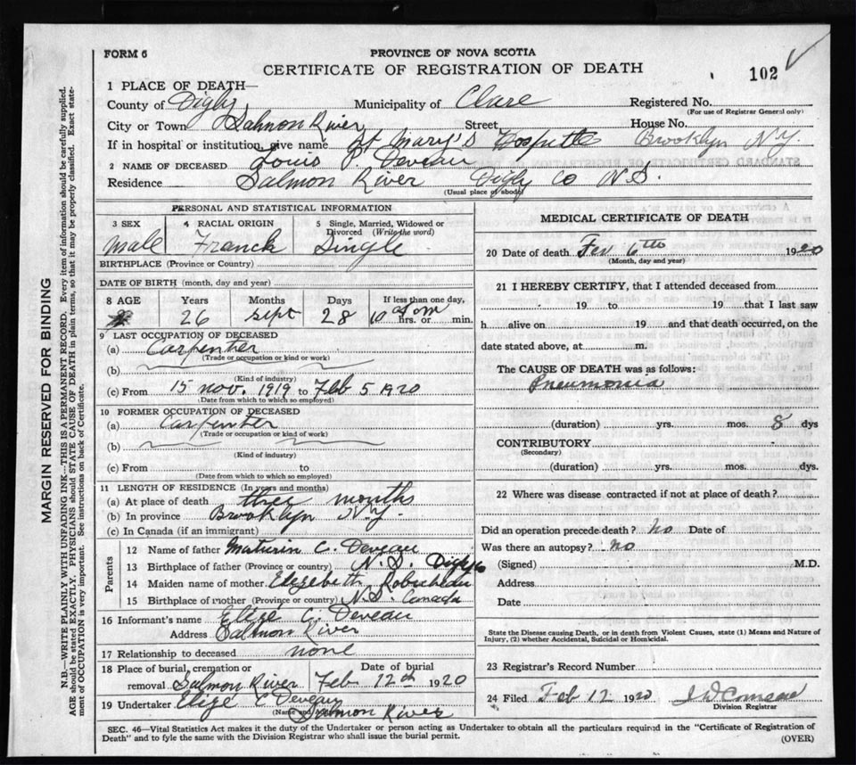 Death Registration: Year: 1920 file: 66 number: 102
