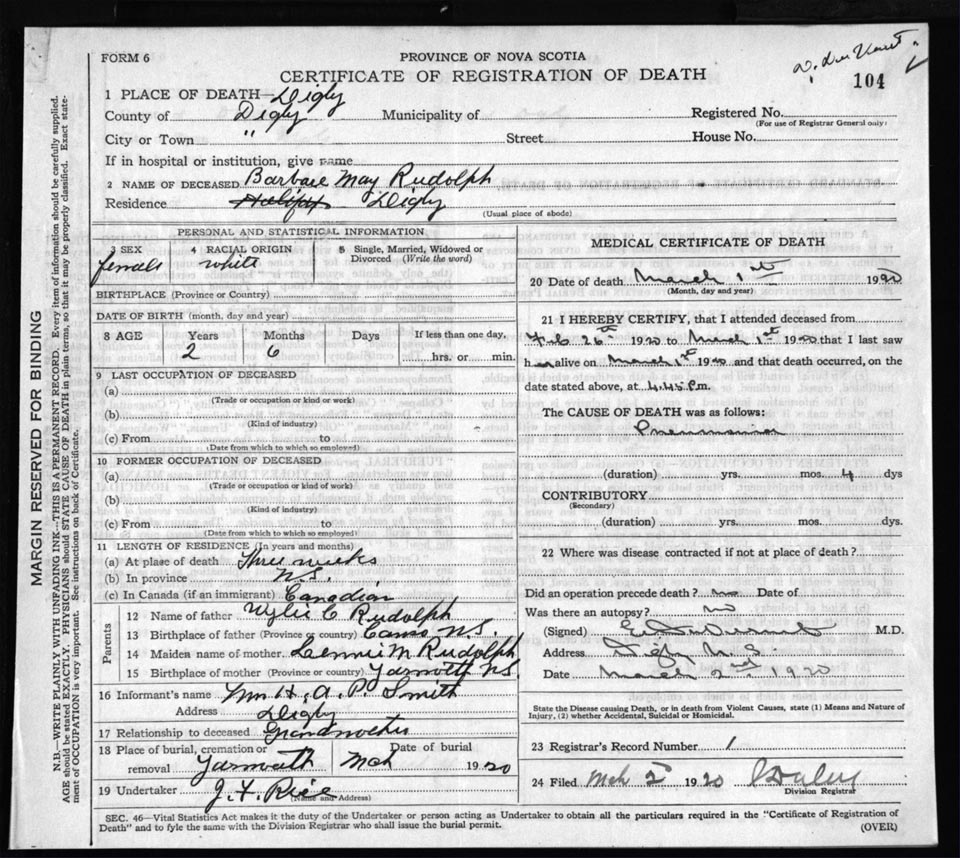 Death Registration: Year: 1920 file: 66 number: 104