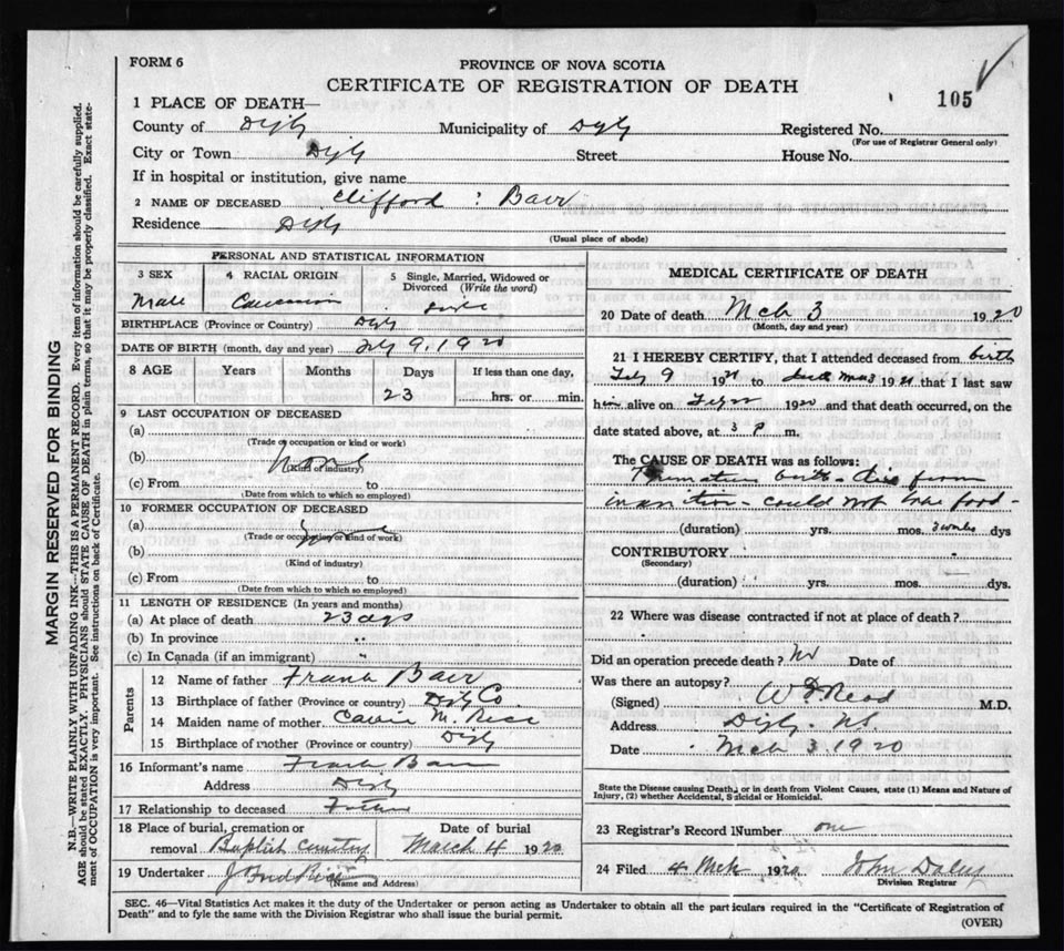 Death Registration: Year: 1920 file: 66 number: 105