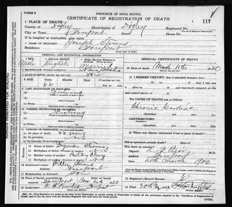 Death Registration: Year: 1920 file: 66 number: 117