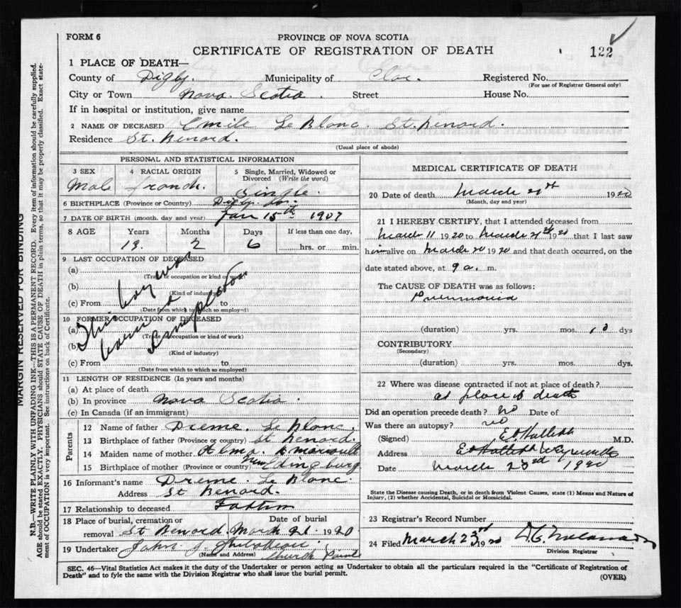 Death Registration: Year: 1920 file: 66 number: 122
