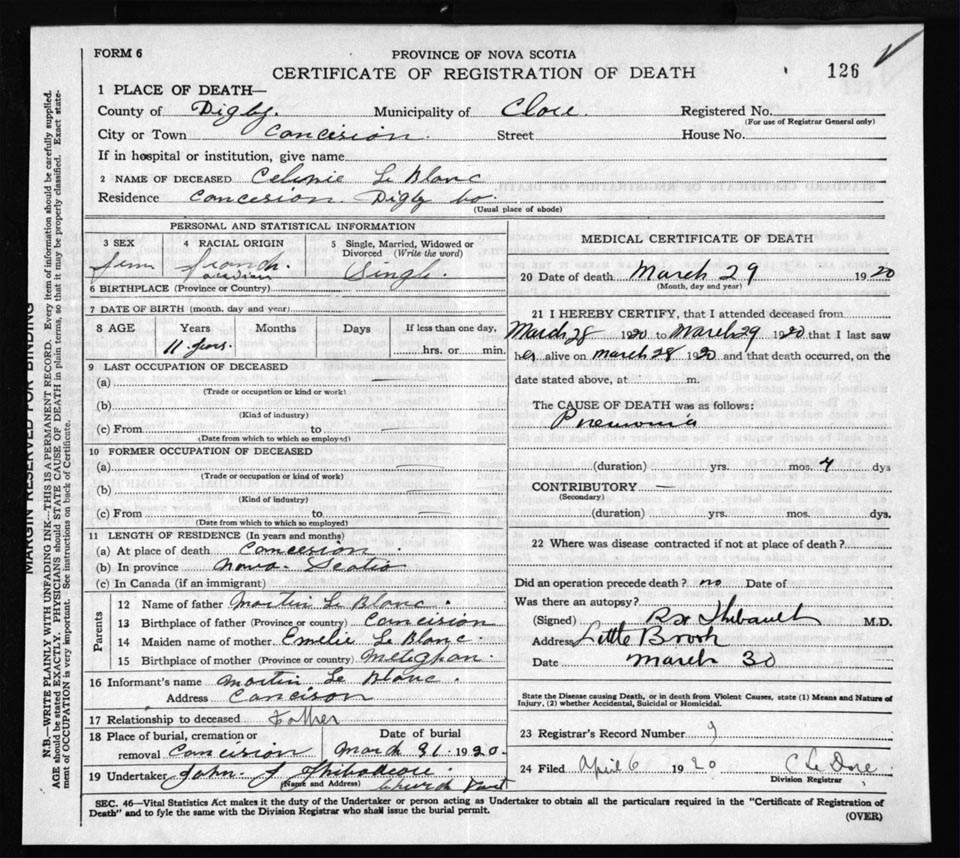 Death Registration: Year: 1920 file: 66 number: 126