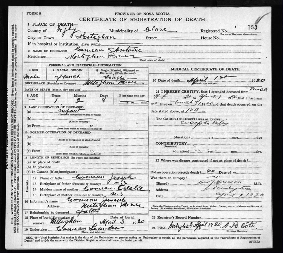 Death Registration: Year: 1920 file: 66 number: 153
