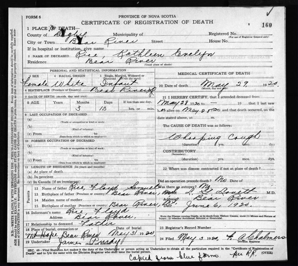 Death Registration: Year: 1920 file: 66 number: 160