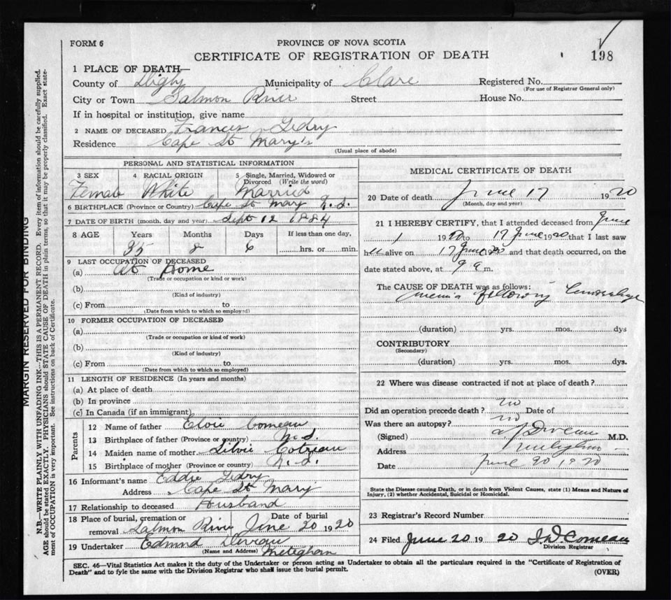 Death Registration: Year: 1920 file: 66 number: 198