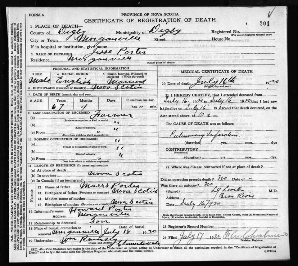 Death Registration: Year: 1920 file: 66 number: 204