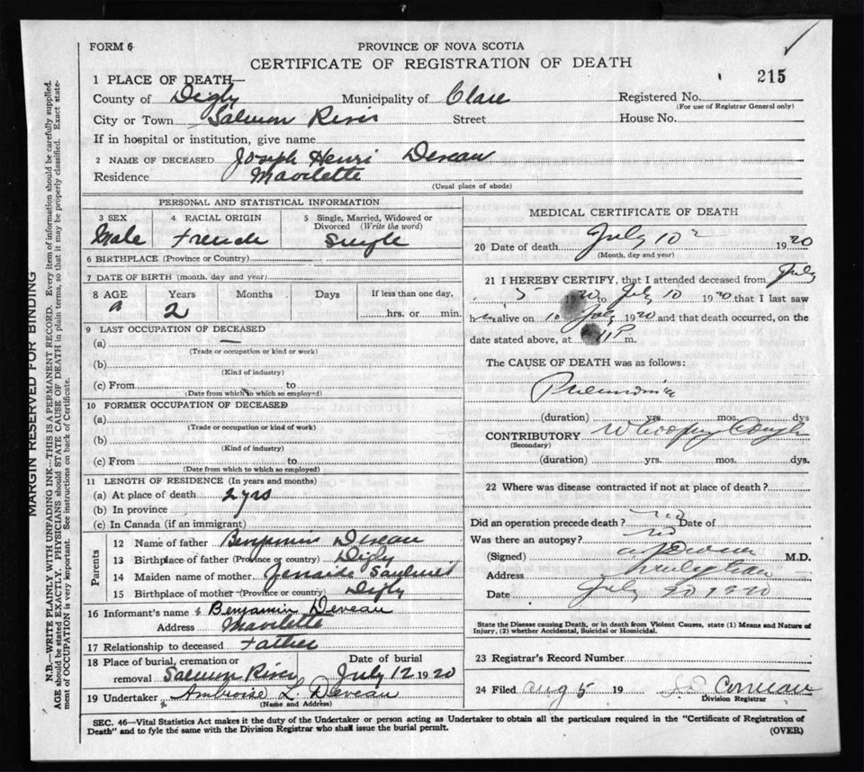 Death Registration: Year: 1920 file: 66 number: 215