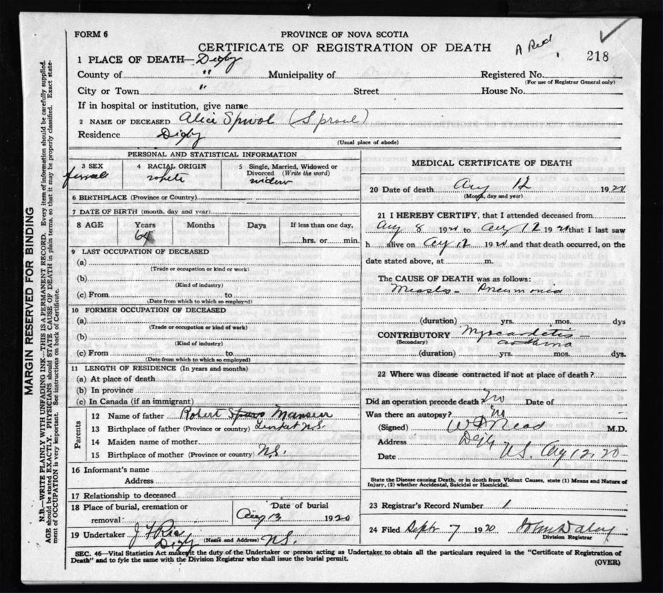 Death Registration: Year: 1920 file: 66 number: 218