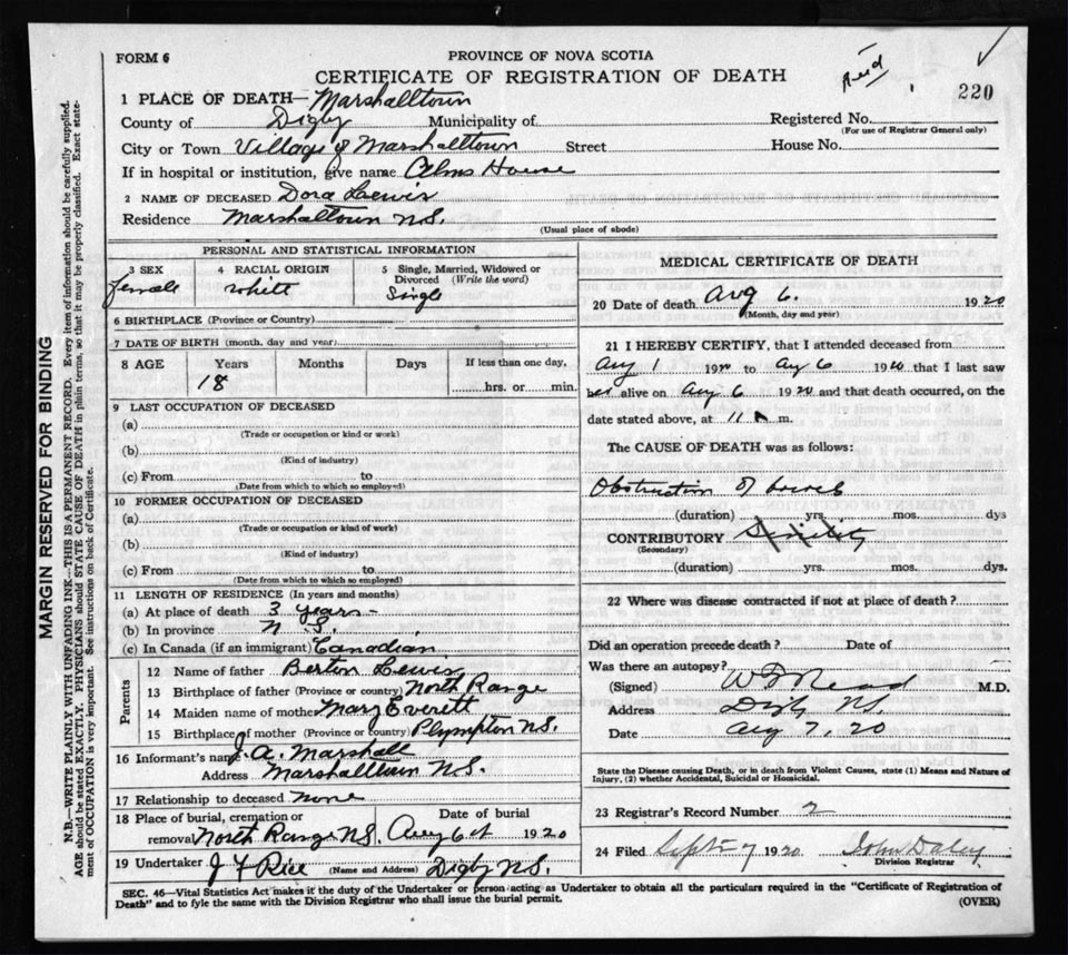 Death Registration: Year: 1920 file: 66 number: 220