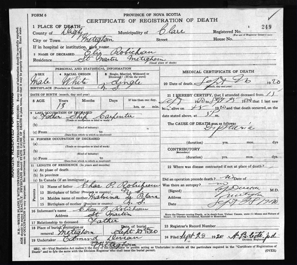 Death Registration: Year: 1920 file: 66 number: 249