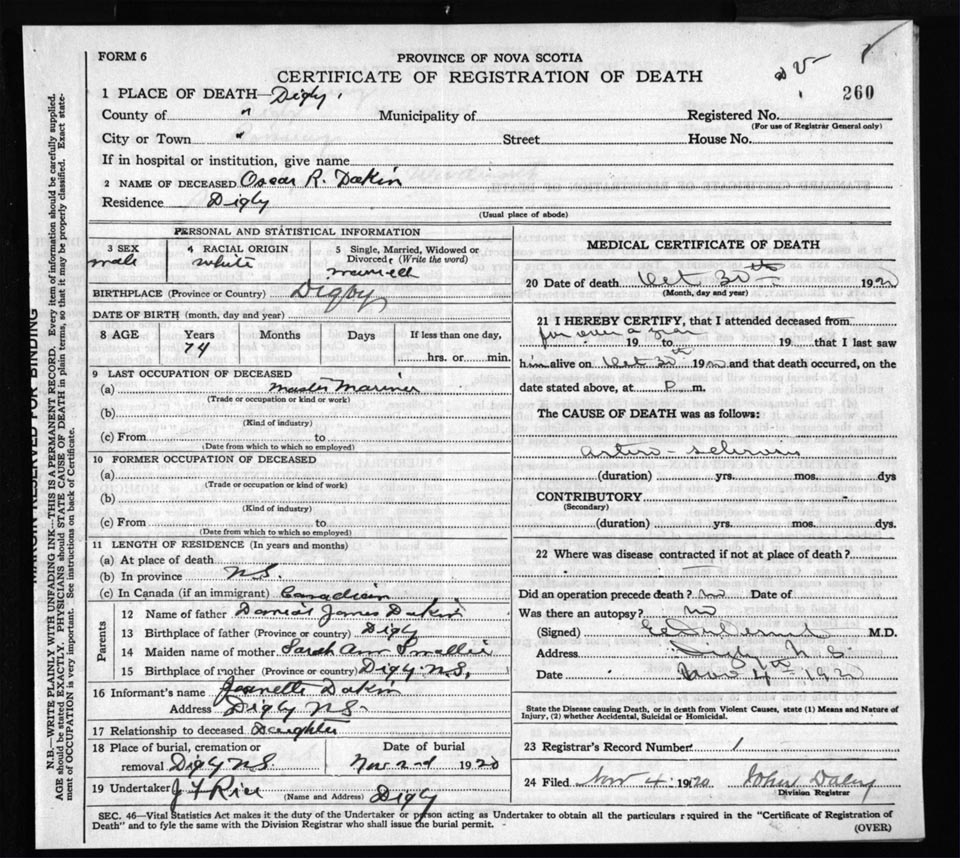 Death Registration: Year: 1920 file: 66 number: 260