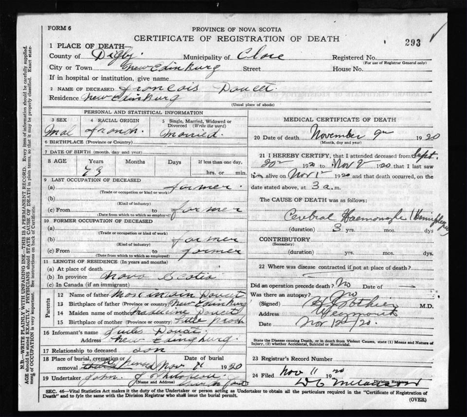 Death Registration: Year: 1920 file: 66 number: 293