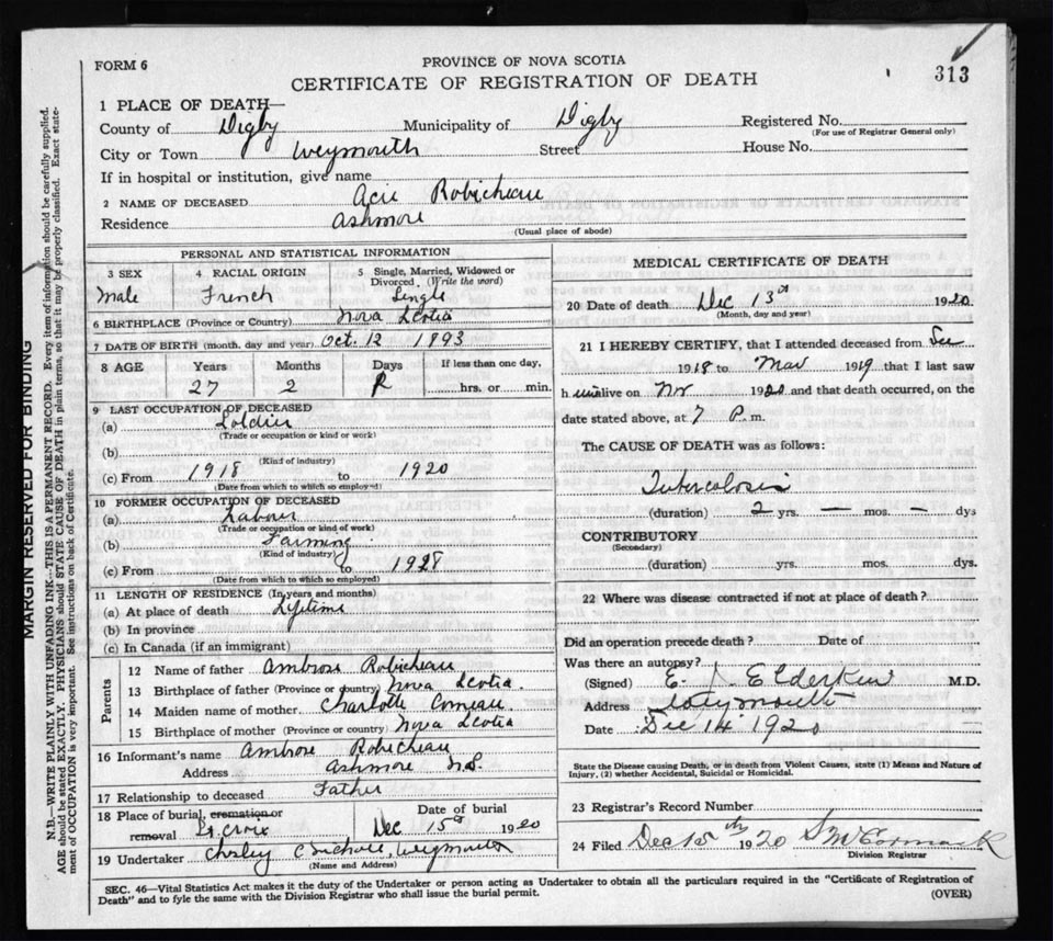 Male Death Registration: Year: 1920 file: 66 number: 313