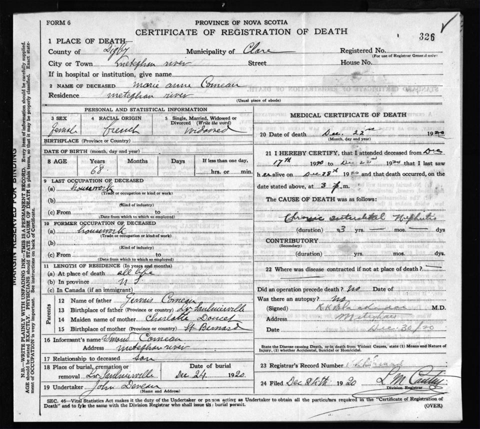 Death Registration: Year: 1920 file: 66 number: 326
