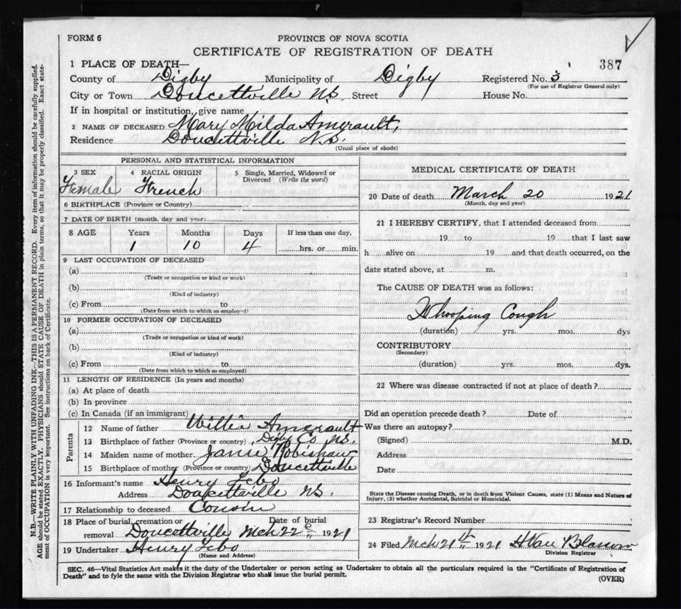Death Registration: Year: 1921 file: 66 number: 387