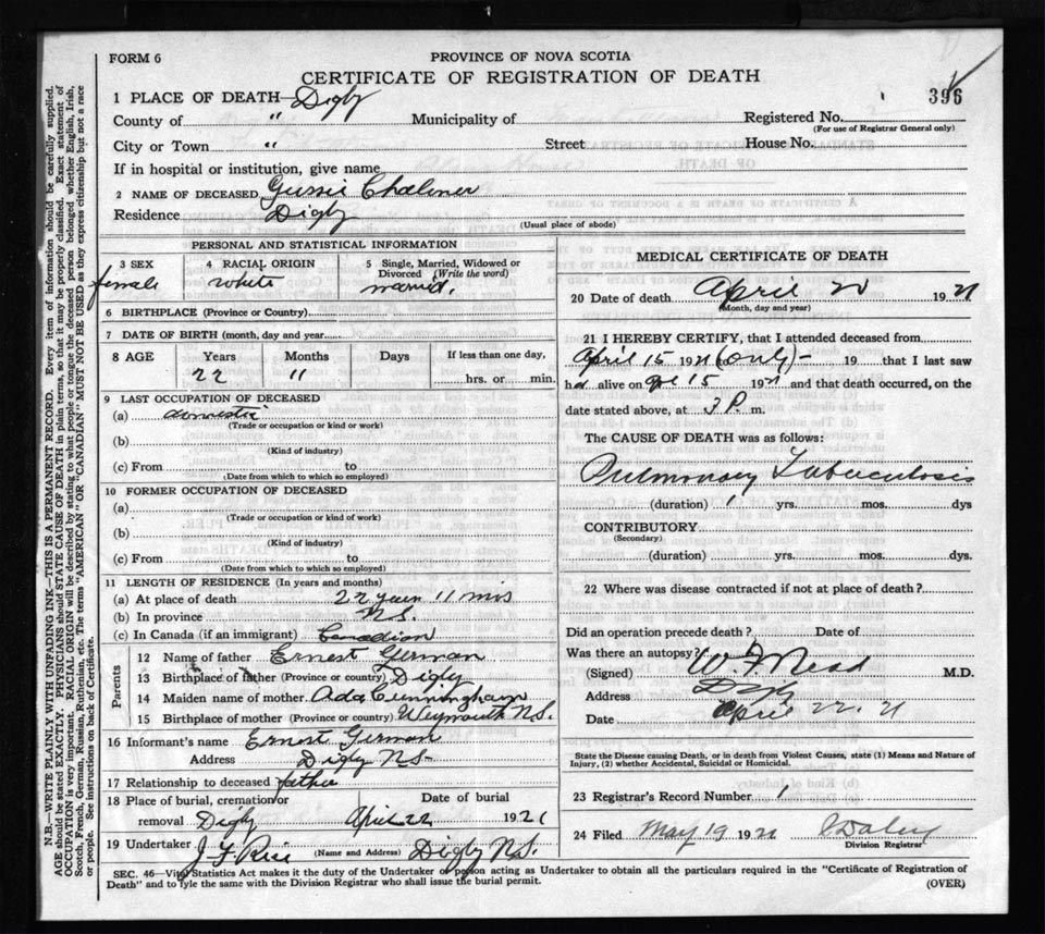 Death Registration: Year: 1921 file: 66 number: 396
