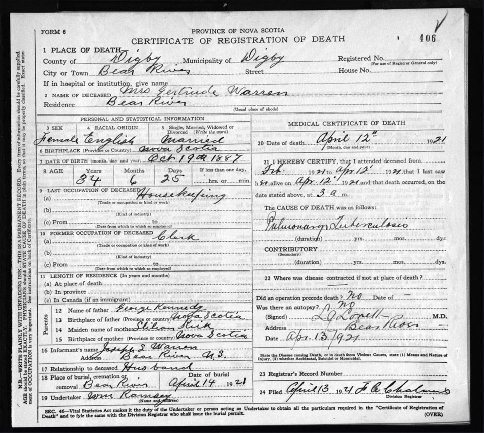 Death Registration: Year: 1921 file: 66 number: 406