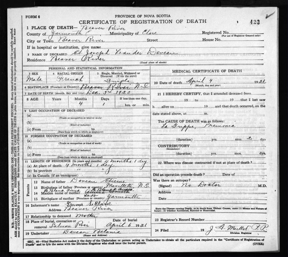 Death Registration: Year: 1921 file: 66 number: 423