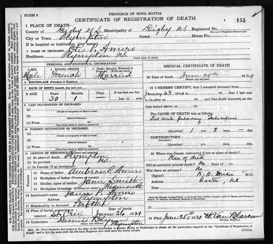 Death Registration: Year: 1921 file: 66 number: 455