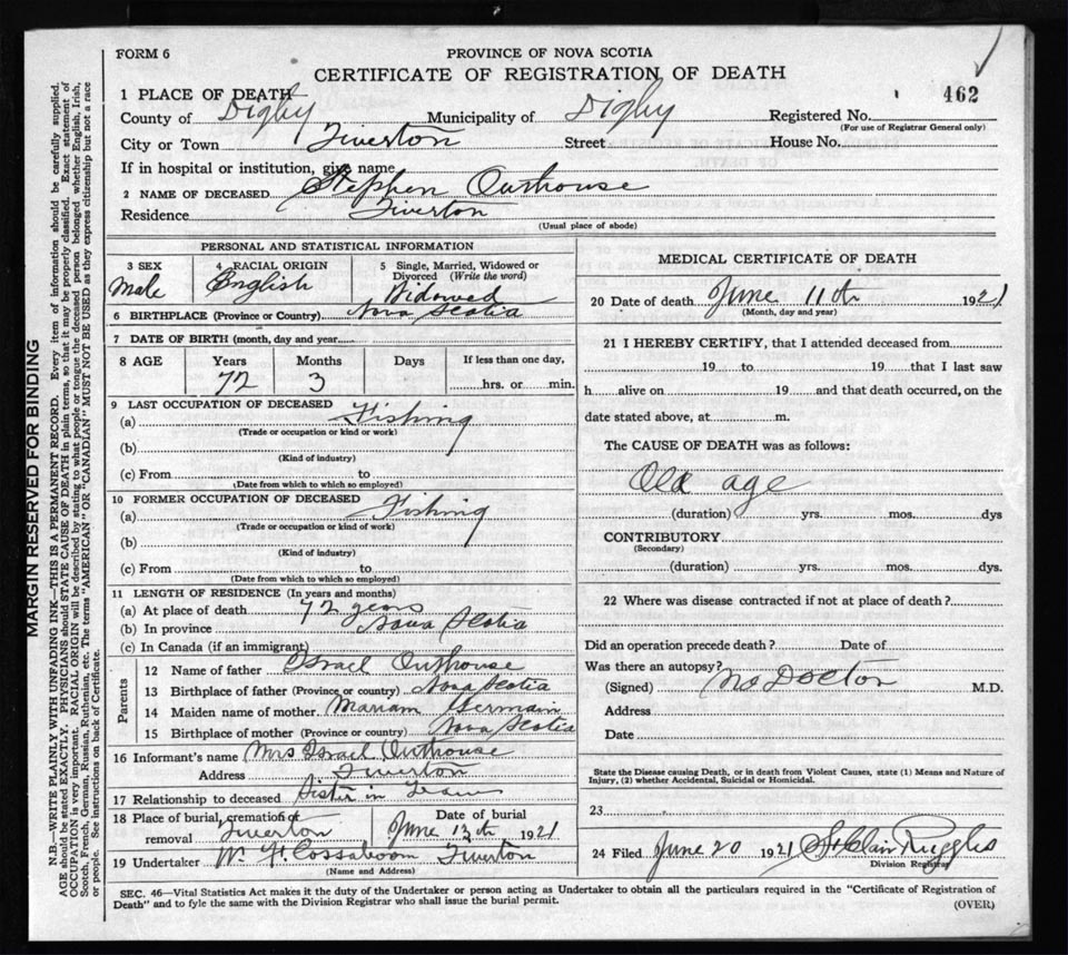 Death Registration: Year: 1921 file: 66 number: 462