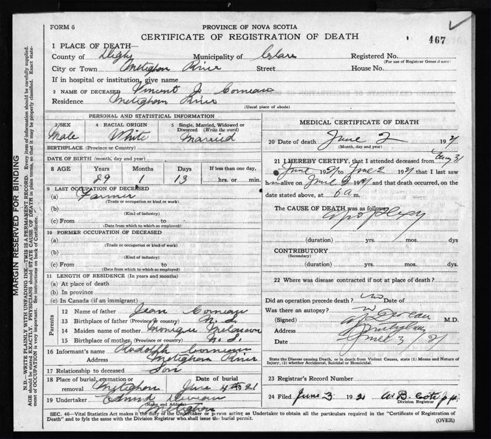 Death Registration: Year: 1921 file: 66 number: 467