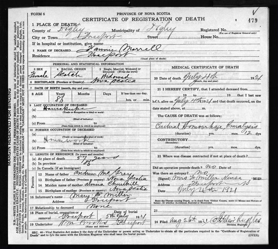 Death Registration: Year: 1921 file: 66 number: 479