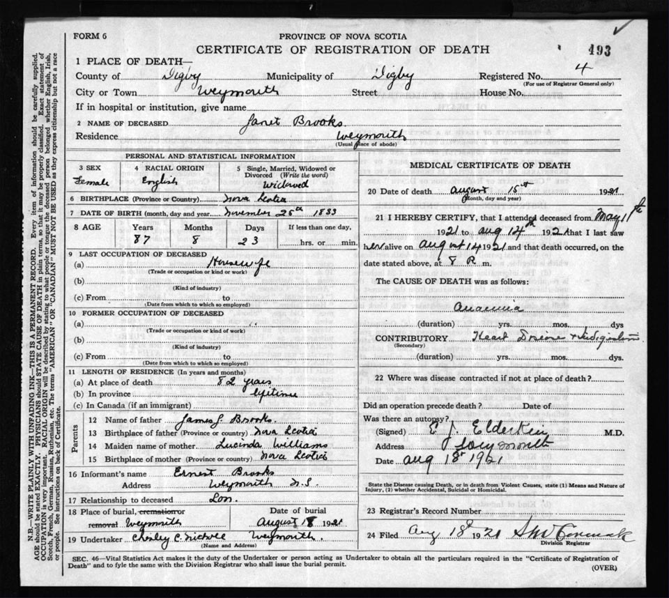 Death Registration: Year: 1921 file: 66 number: 493