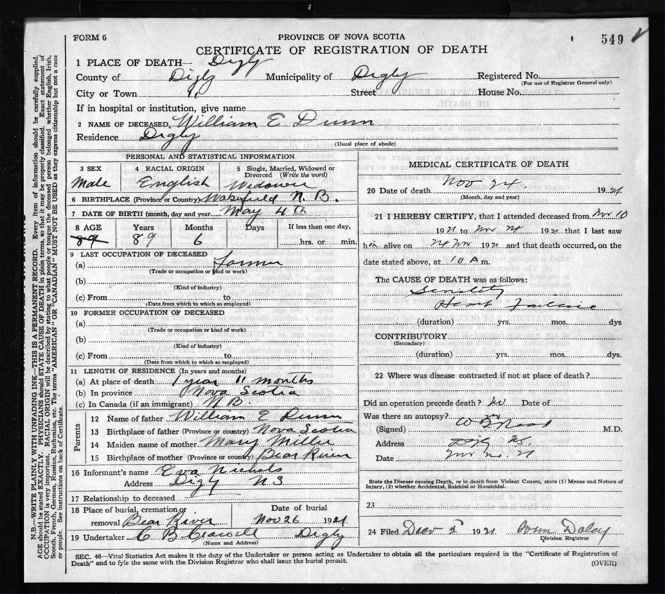 Death Registration: Year: 1921 file: 66 number: 549