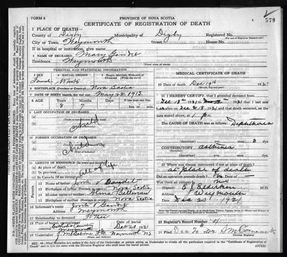 Death Registration: Year: 1921 file: 66 number: 579