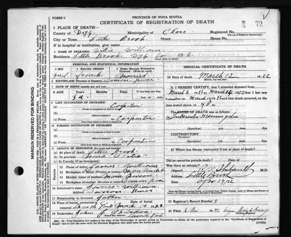 Death Registration: Year: 1922 file: 67 number: 72