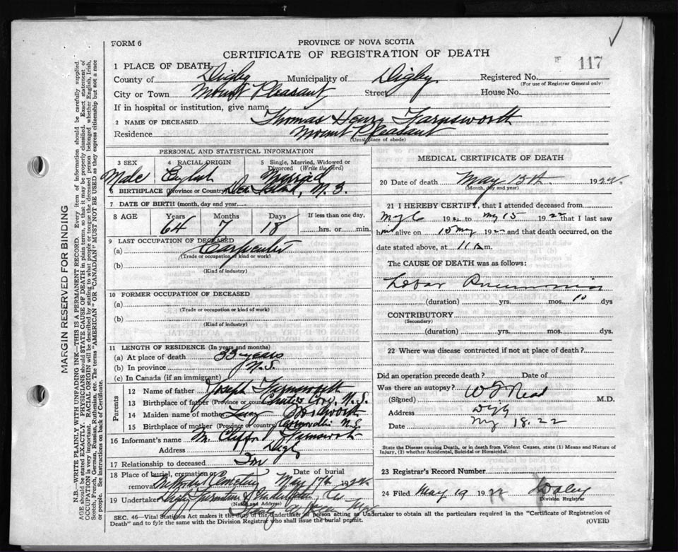 Death Registration: Year: 1922 file: 67 number: 117