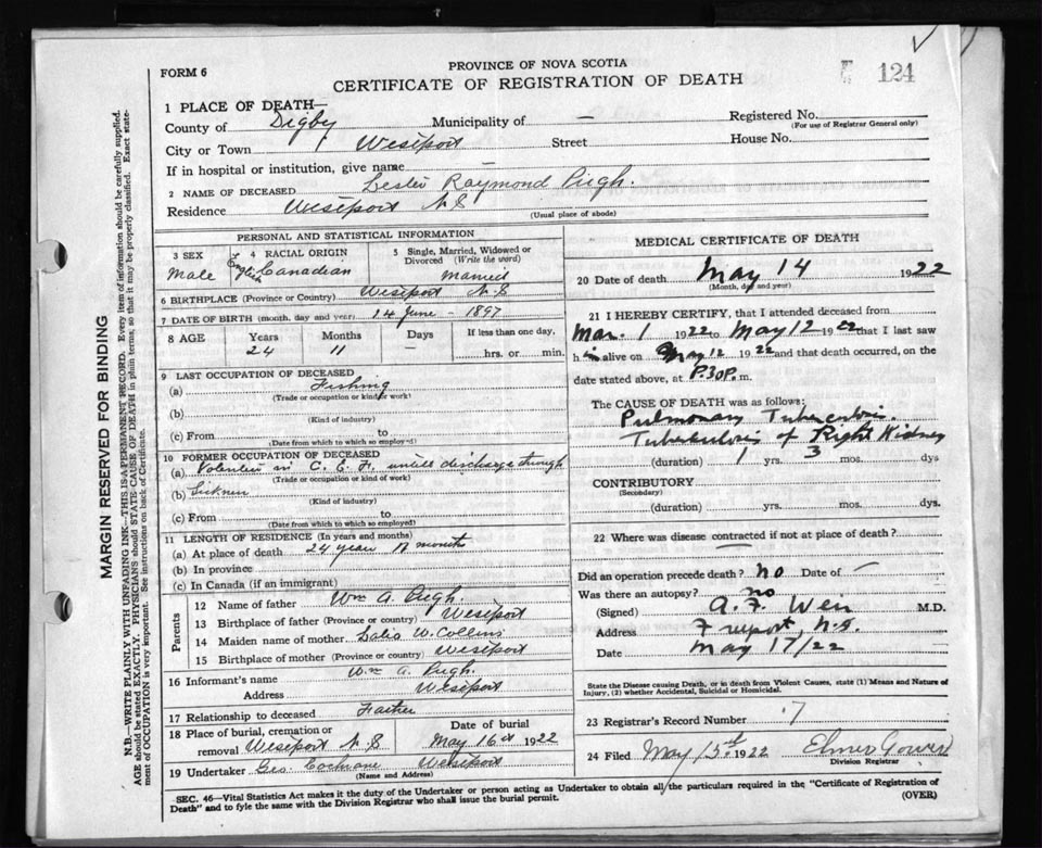 Death Registration: Year: 1922 file: 67 number: 124