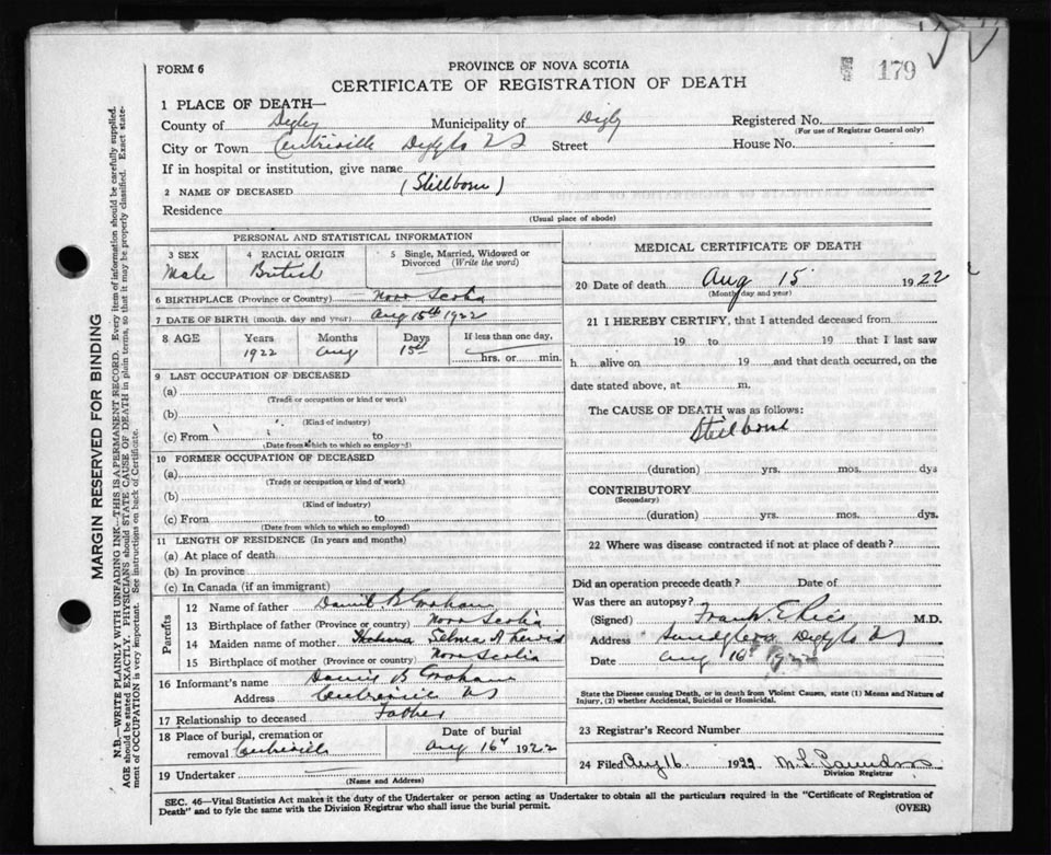 Male Death Registration: Year: 1922 file: 67 number: 179