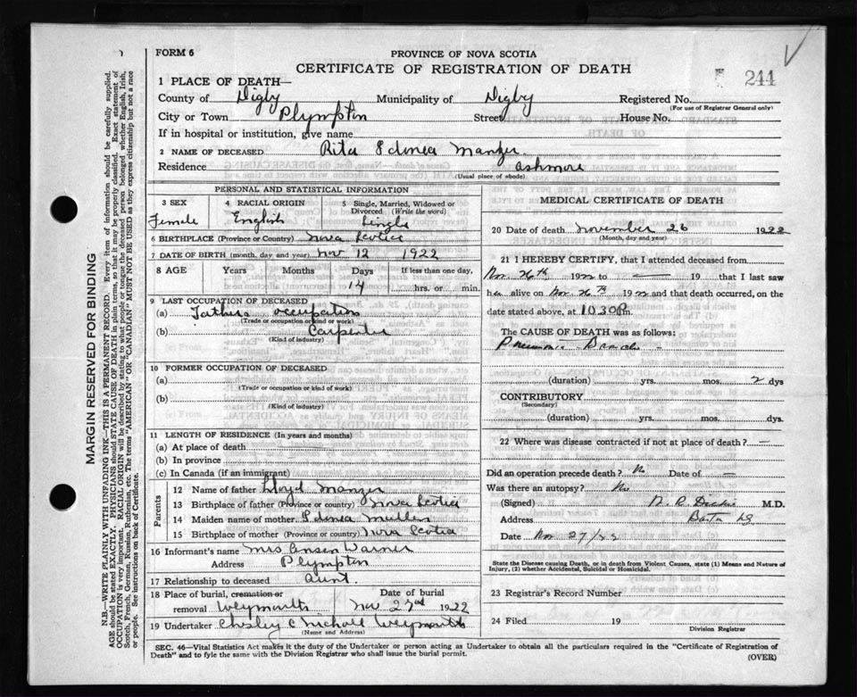Death Registration: Year: 1922 file: 67 number: 244