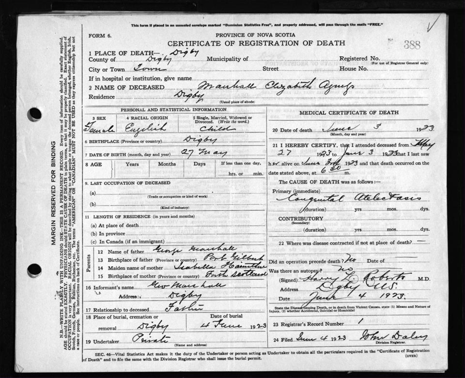 Death Registration: Year: 1923 file: 67 number: 388