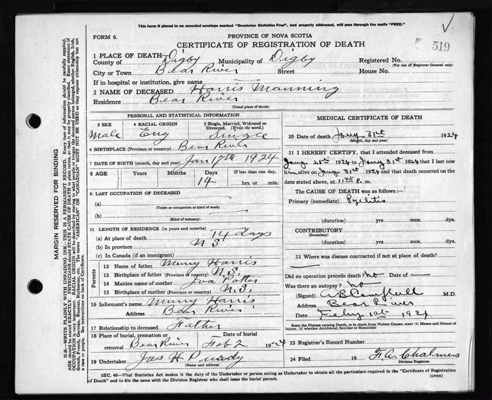 Death Registration: Year: 1924 file: 67 number: 519