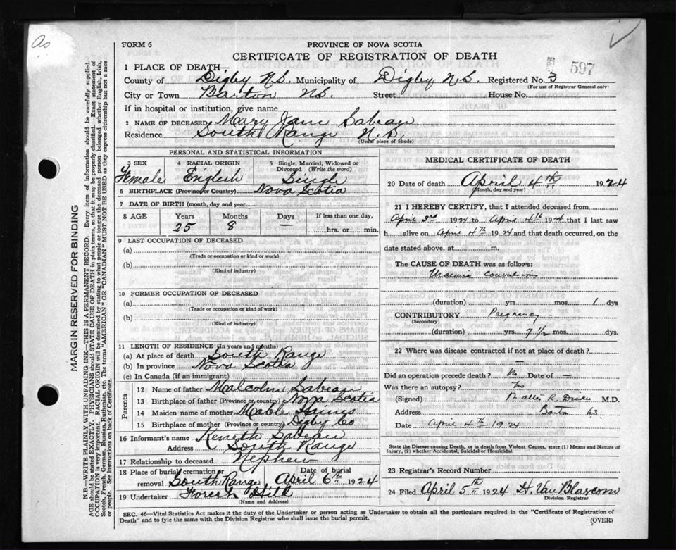 Death Registration: Year: 1924 file: 67 number: 597