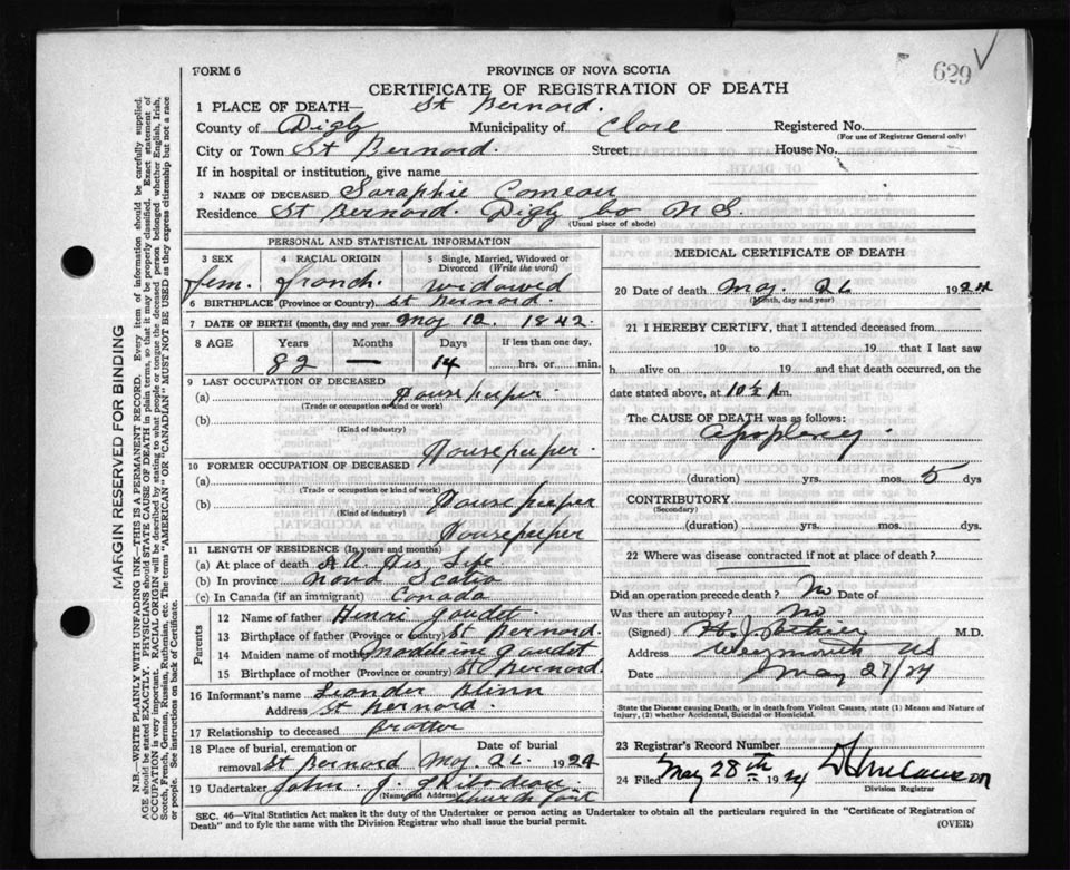 Death Registration: Year: 1924 file: 67 number: 629