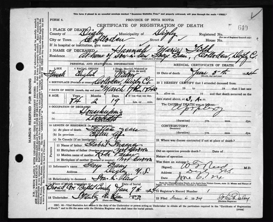 Death Registration: Year: 1924 file: 67 number: 640