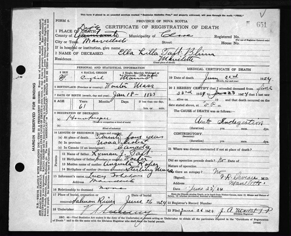 Death Registration: Year: 1924 file: 67 number: 651