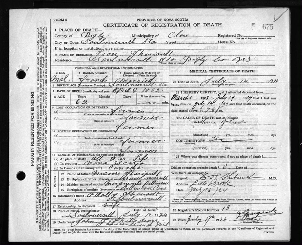 Death Registration: Year: 1924 file: 67 number: 675