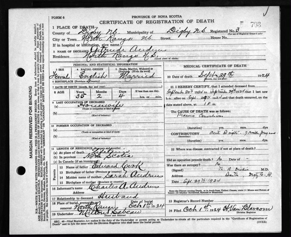 Death Registration: Year: 1924 file: 67 number: 703