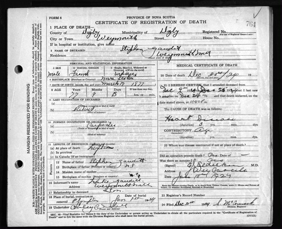 Death Registration: Year: 1924 file: 67 number: 764
