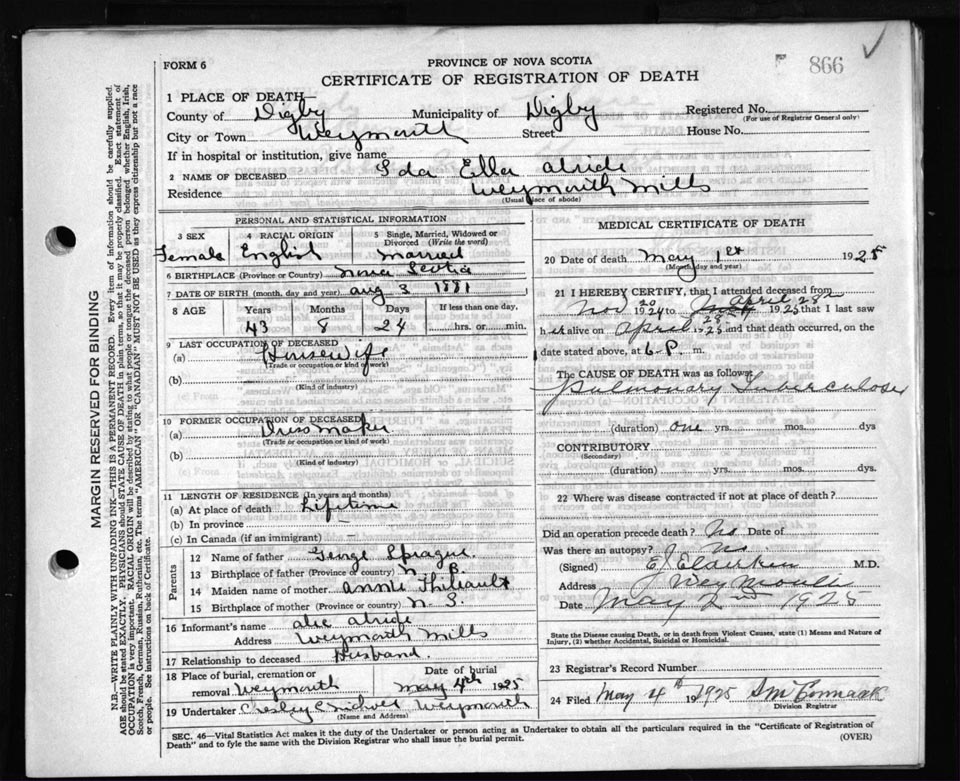 Death Registration: Year: 1925 file: 67 number: 866
