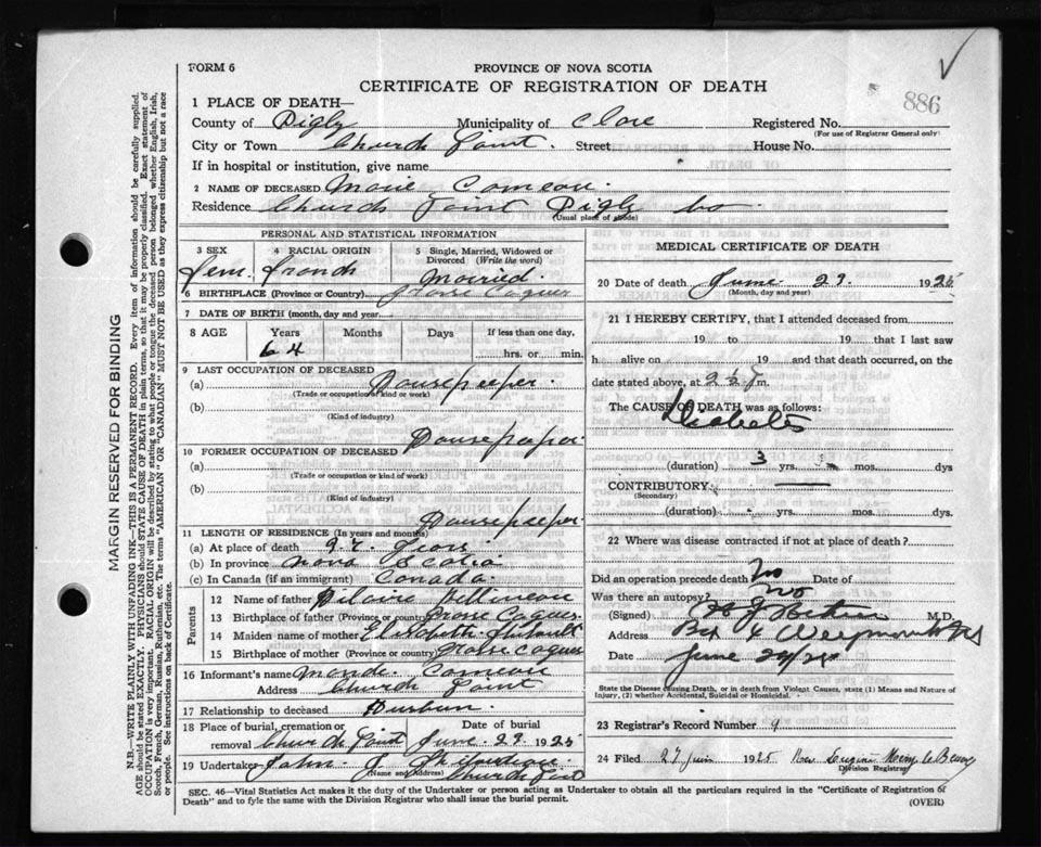 Death Registration: Year: 1925 file: 67 number: 886