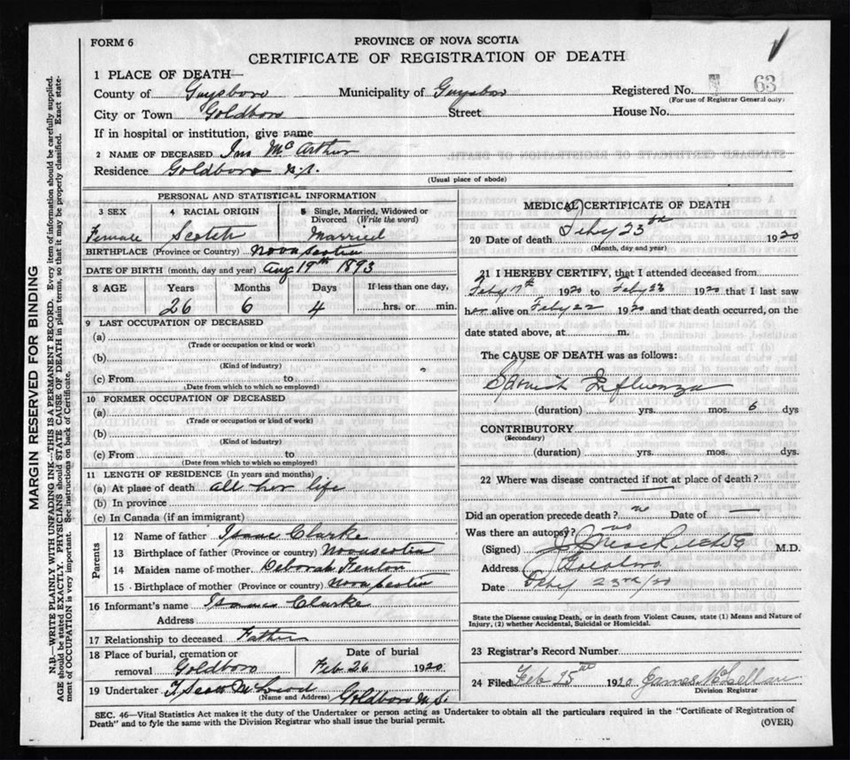 Death Registration: Year: 1920 file: 68 number: 63